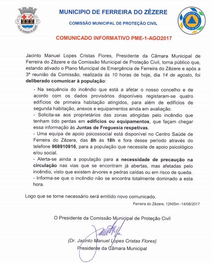 FreguesiasFerreira do ZêzereProteção CivilIncêndio Incêndio – Comunicado à população Por regiaodozezere - Agosto 14, 2017 0 Share Facebook Twitter Google+ Pinterest WhatsApp
