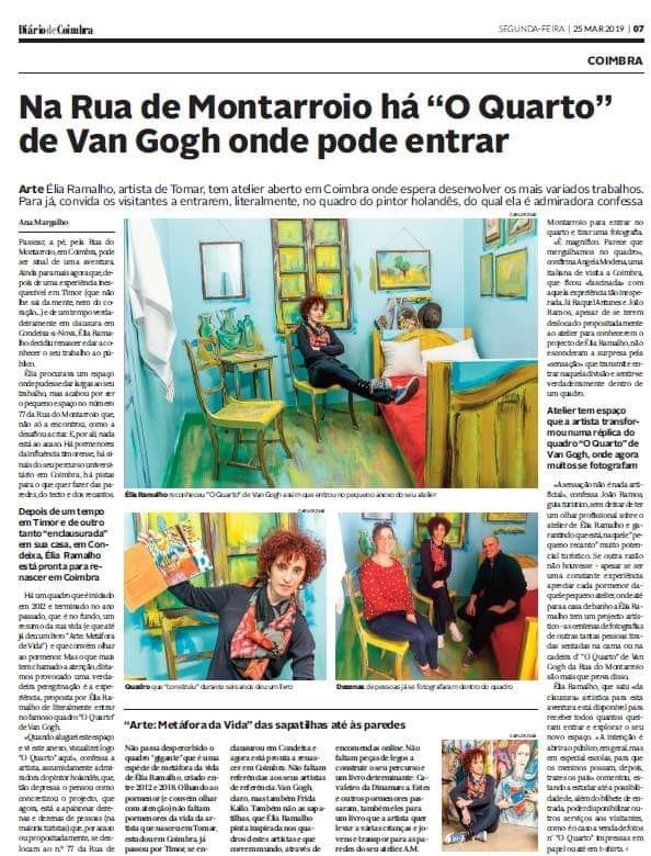 O mais recente trabalho da artista ferreirense Élia Ramalho está a ter um grande sucesso. No seu atelier em Coimbra “O quarto” de Van Gogh é uma obra em tamanho real, onde as pessoas se podem sentar ou deitar.