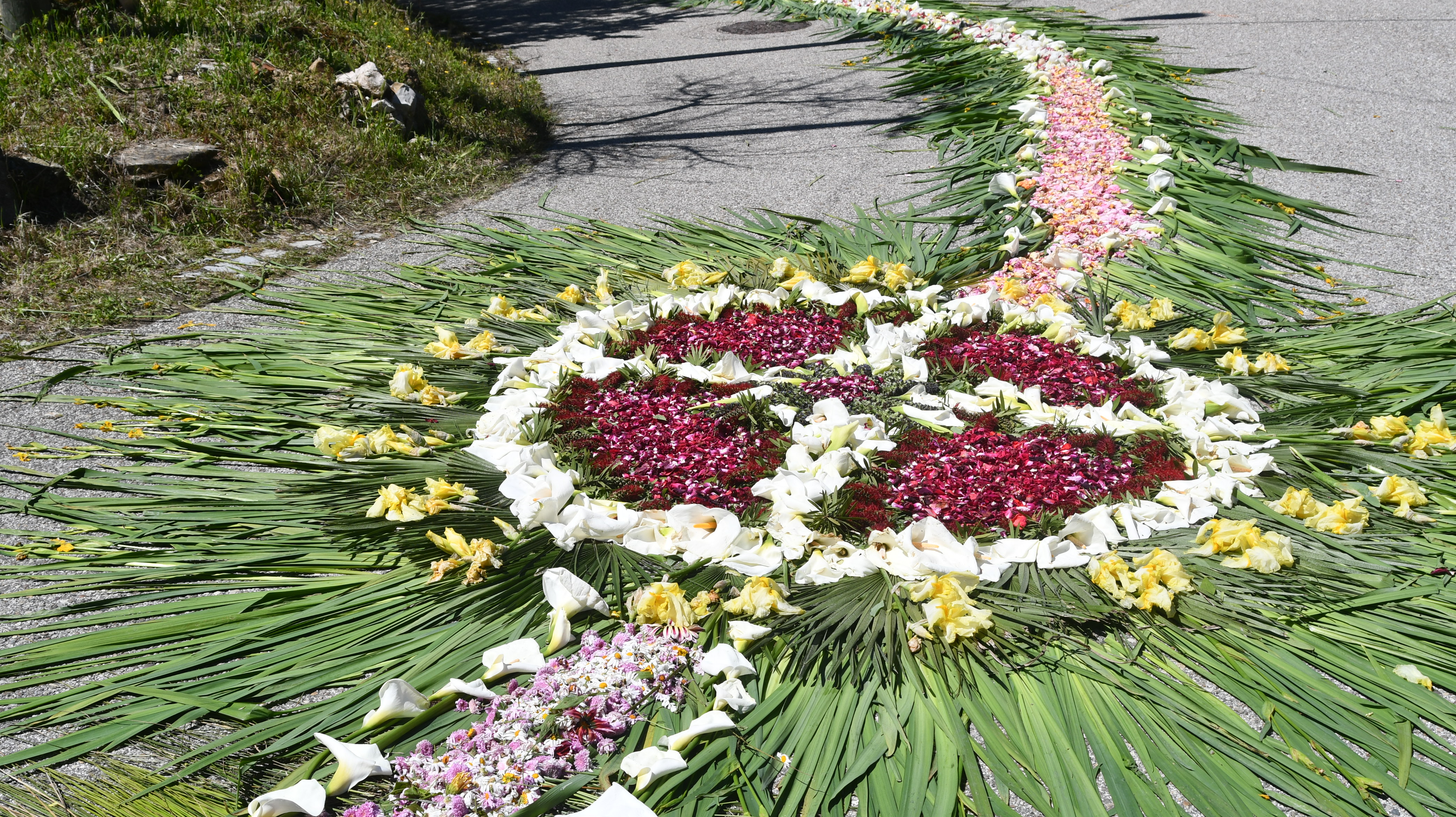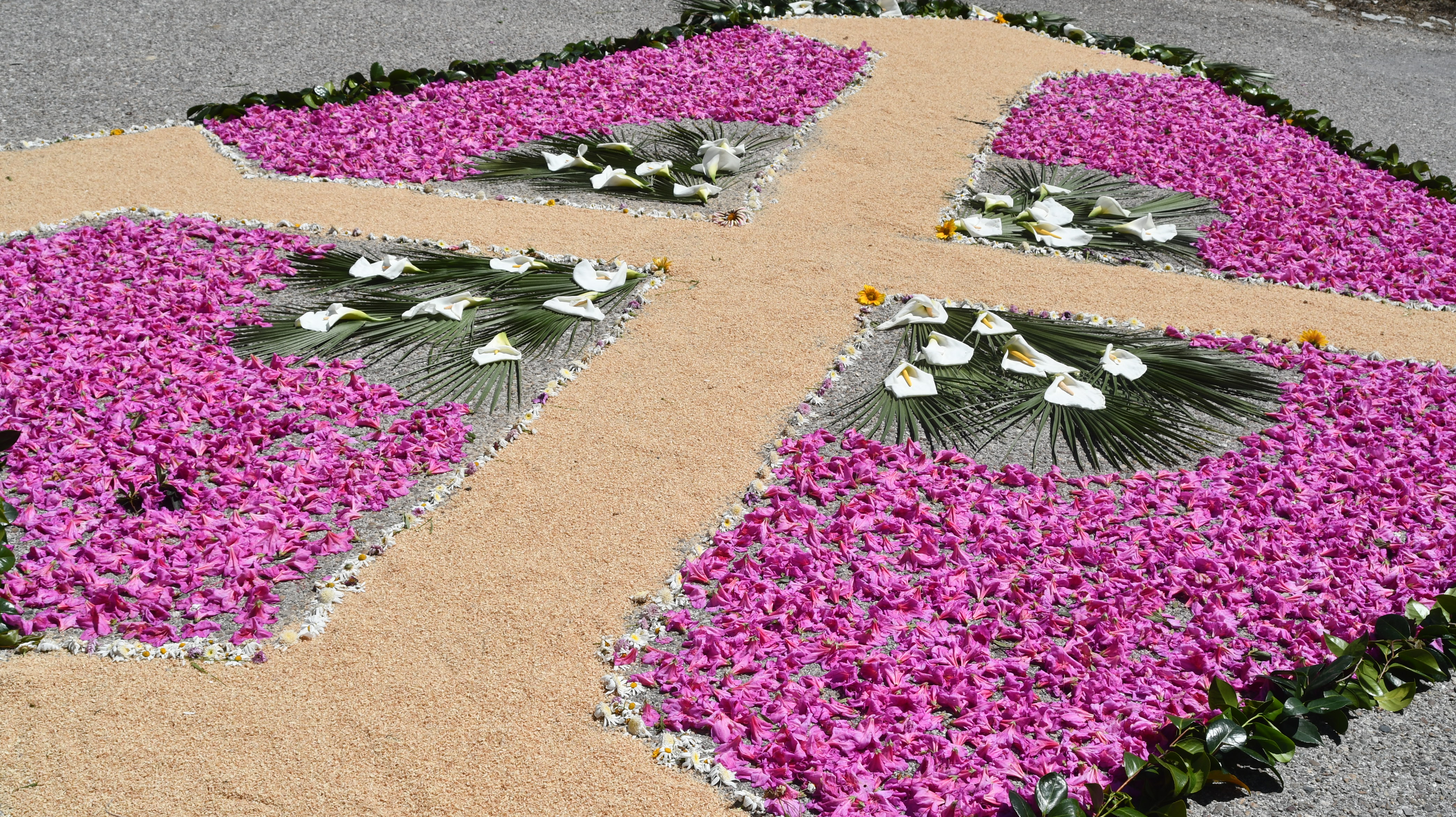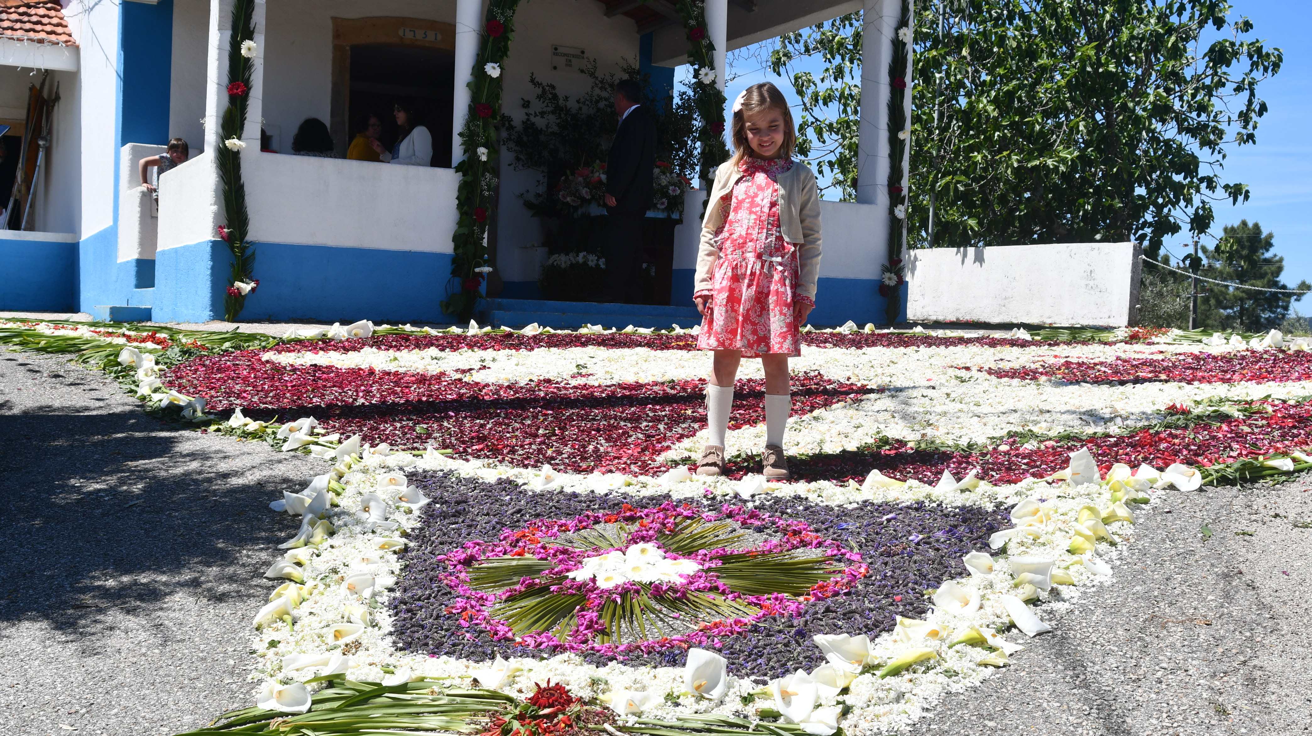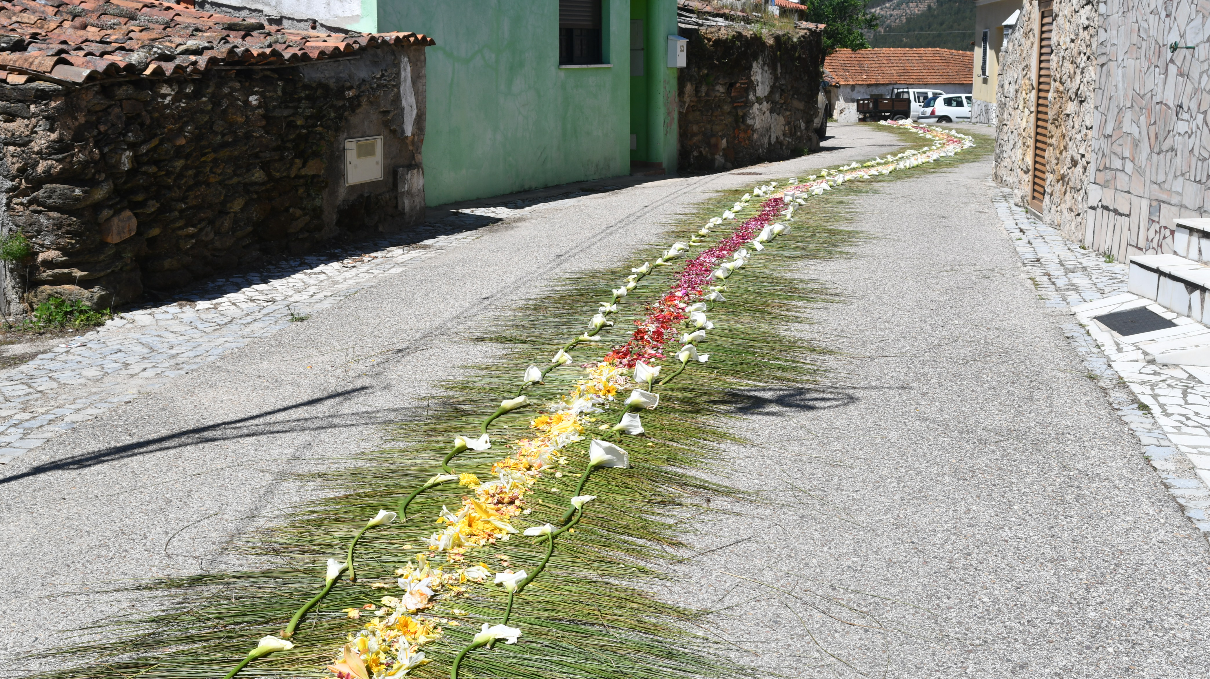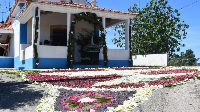 Os longos tapetes de flores naturais orientam os fieis das principais ruas da localidade para a capela neste principal dia de festa com a Eucaristia.