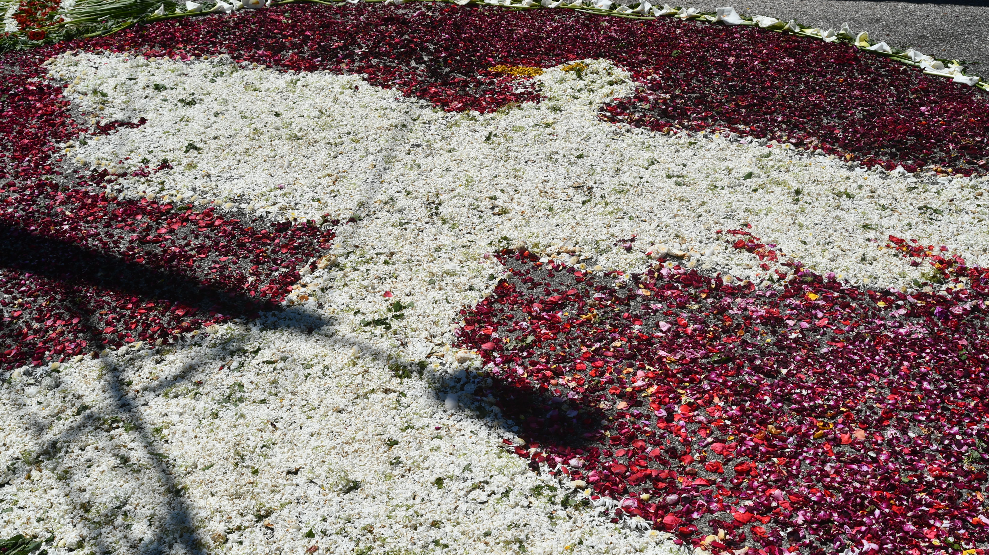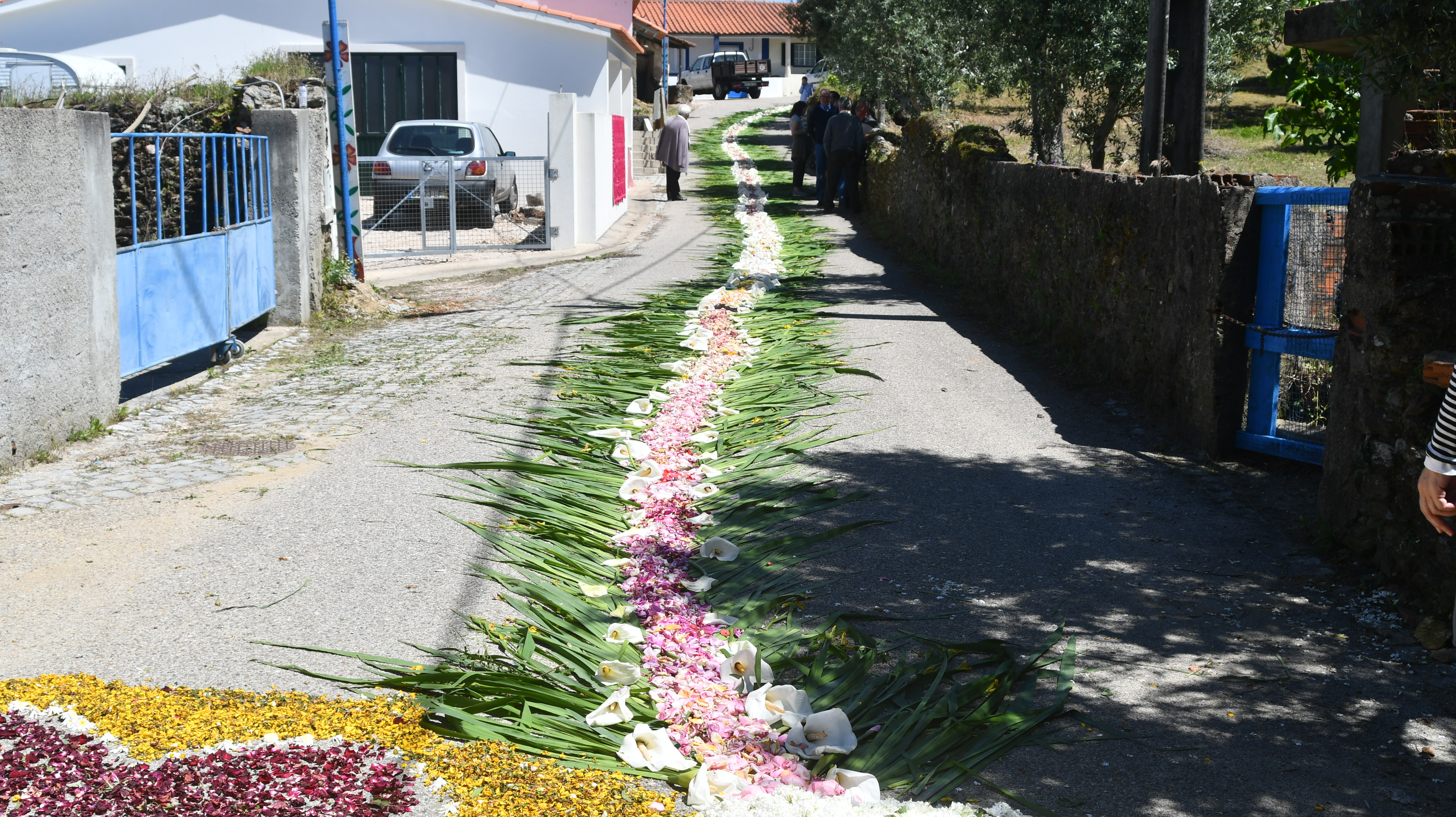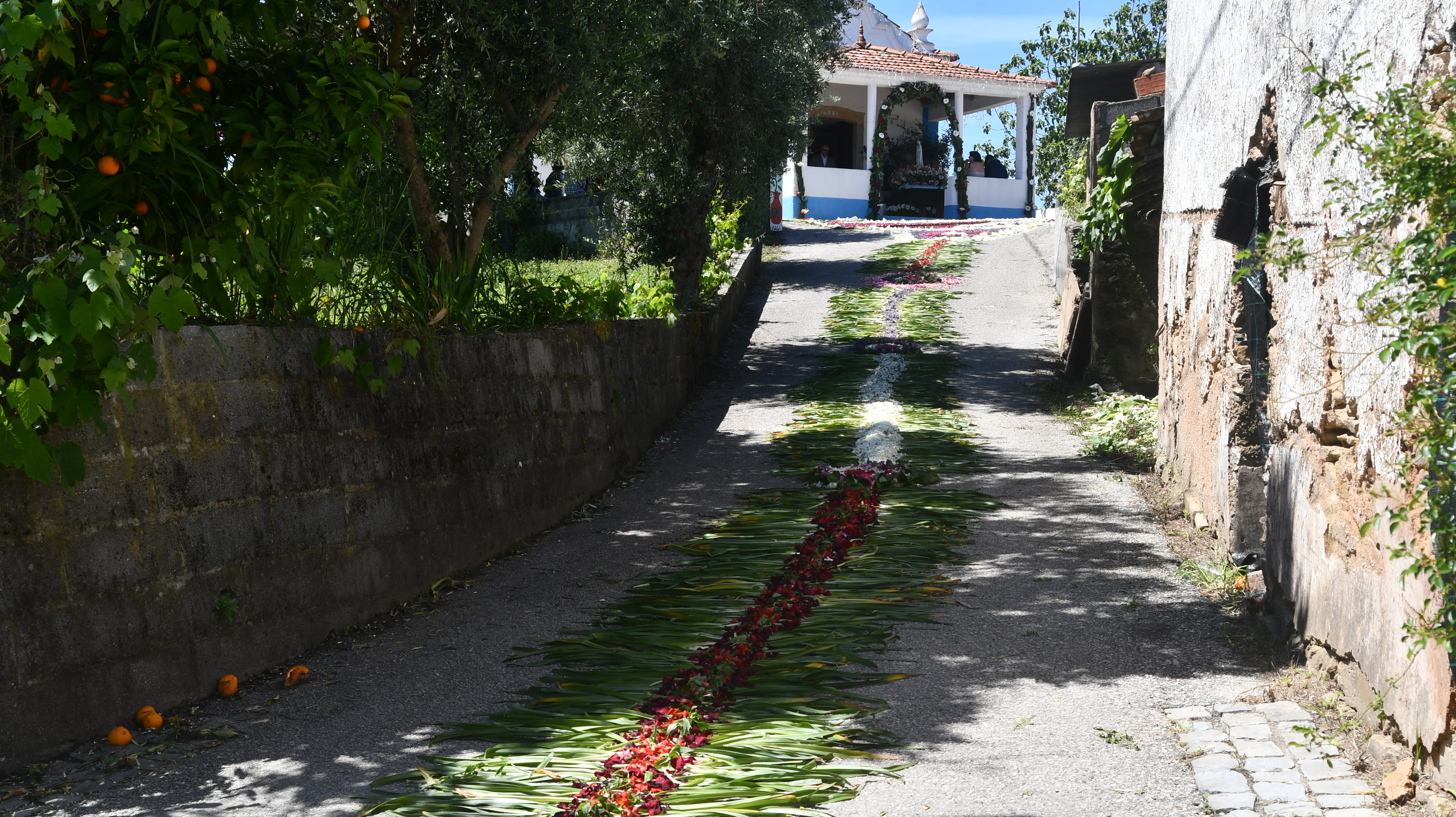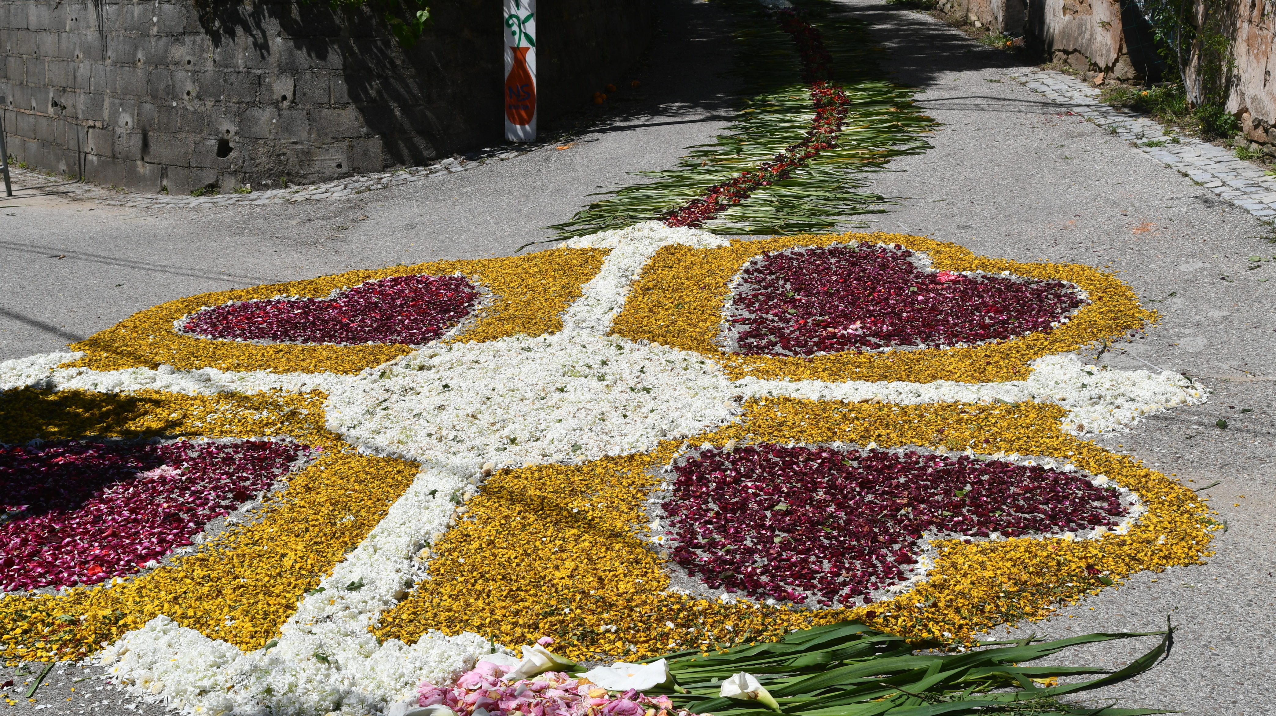 Os longos tapetes de flores naturais orientam os fieis das principais ruas da localidade para a capela neste principal dia de festa com a Eucaristia.