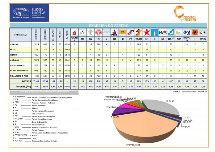 Segundo os resultados provisórios disponibilizados pela Câmara Municipal de Ferreira do Zêzere, o PS foi o partido mais votado no concelho de Ferreira do Zêzere nestas eleições europeias com 36,56%, seguido do PSD com 35,88%, do BE com 7,19% e o CDS com 5,91%. O Pan conseguiu 4,02% dos votos e o PCP com 2,65%.