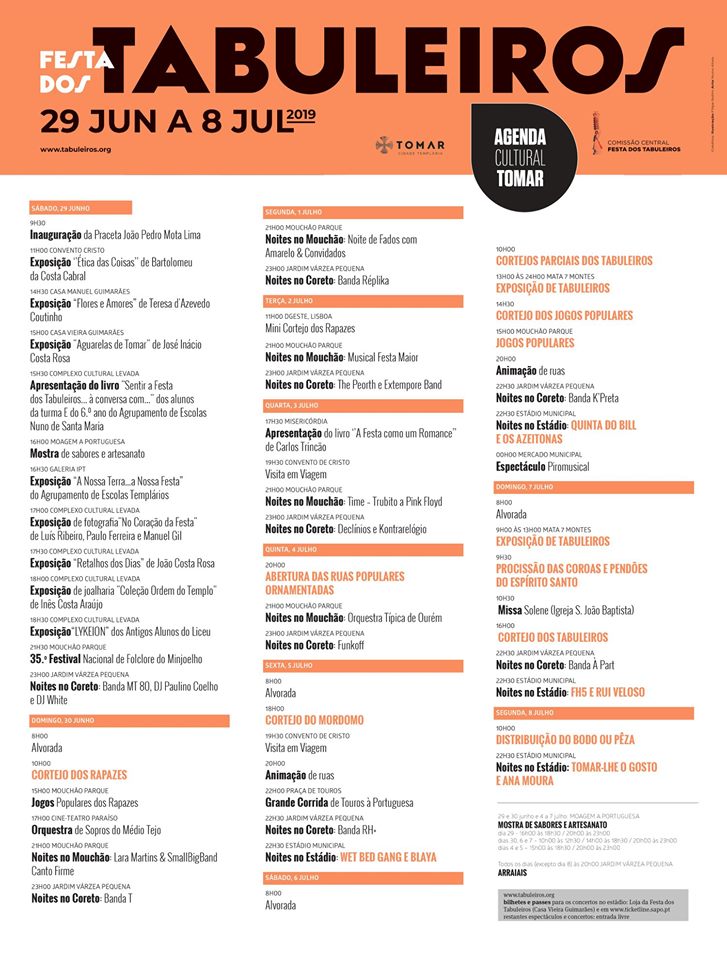 Até dia 8 de julho, num vasto programa que aqui relembramos e que pode ser consultado no site oficial da festa em www.tabuleiros.org e no evento da Festa dos Tabuleiros 2019.