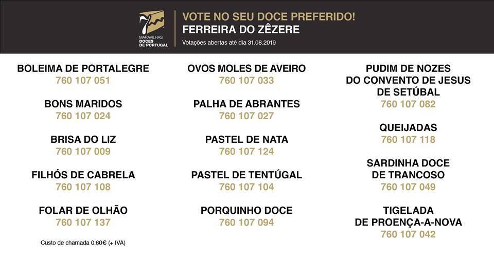 Bons Maridos, de Ferreira do Zêzere, Boleima de Portalegre, Brisa do Liz, Filhós de Cabrela, Folar de Olhão, Ovos Moles de Aveiro, Palha de Abrantes, Pastel de Nata, Pastel de Tentúgal, Porquinho Doce, Pudim de Nozes do Convento de Jesus de Setúbal, Queijadas, Sardinha Doce de Trancoso, e a Tigelada de Proença-a-Nova.