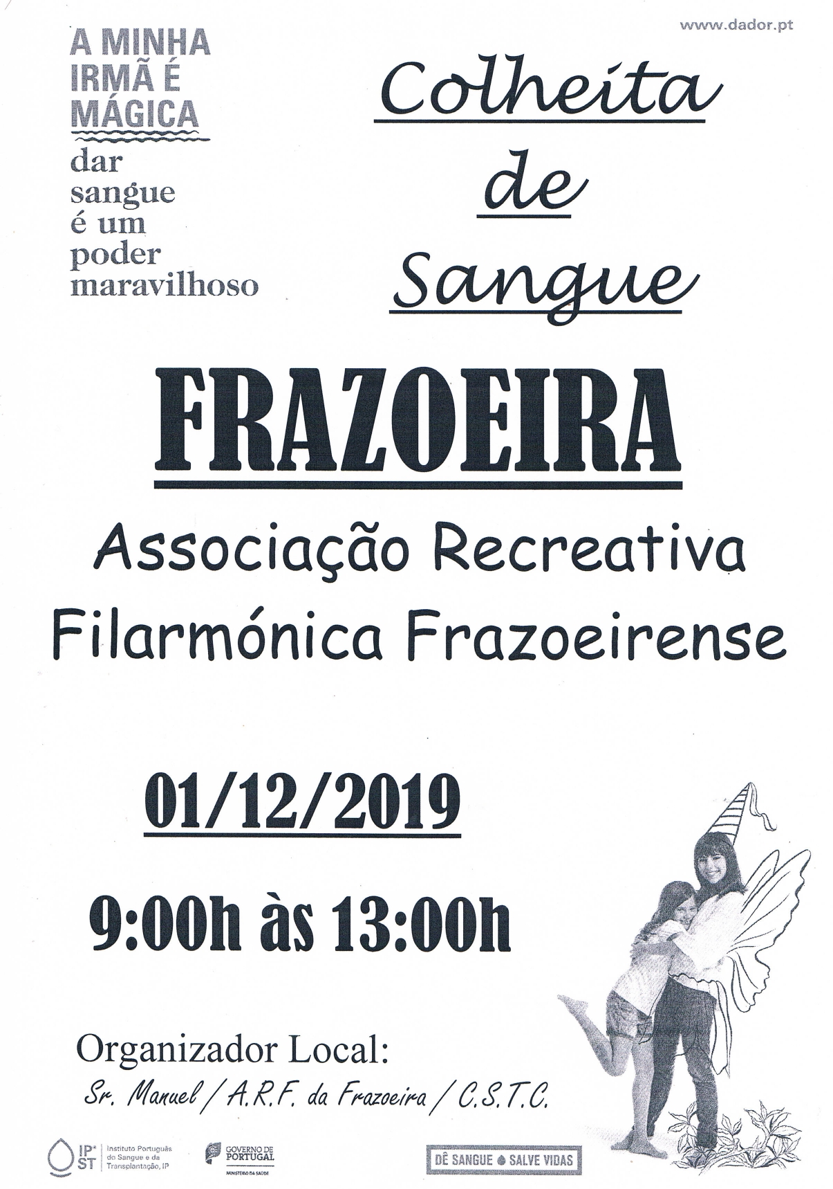 Vai decorrer no próximo dia 1 de dezembro, entre as 9h e as 13h, no salão da Associação Recreativa Filarmónica Frazoeirense, uma colheita de sangue promovida pelo Instituto Português do Sangue. Se reúne as condições, contribua, porque dar Sangue é Dar Vida.