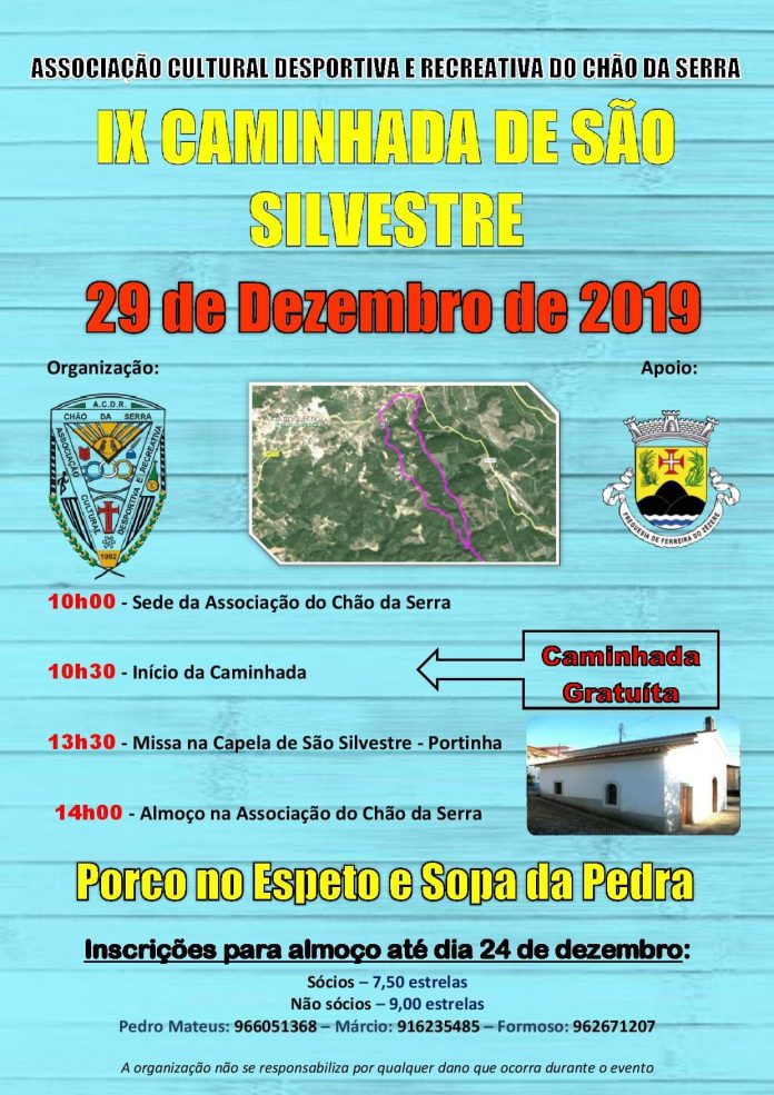 A Associação do Chão da Serra, Ferreira do Zêzere vai promover no próximo dia 29 de dezembro a IX caminhada de São Silvestre. A concentração será às 10h, às 13h30 a missa na capela da Portinha seguida de almoço convívio.