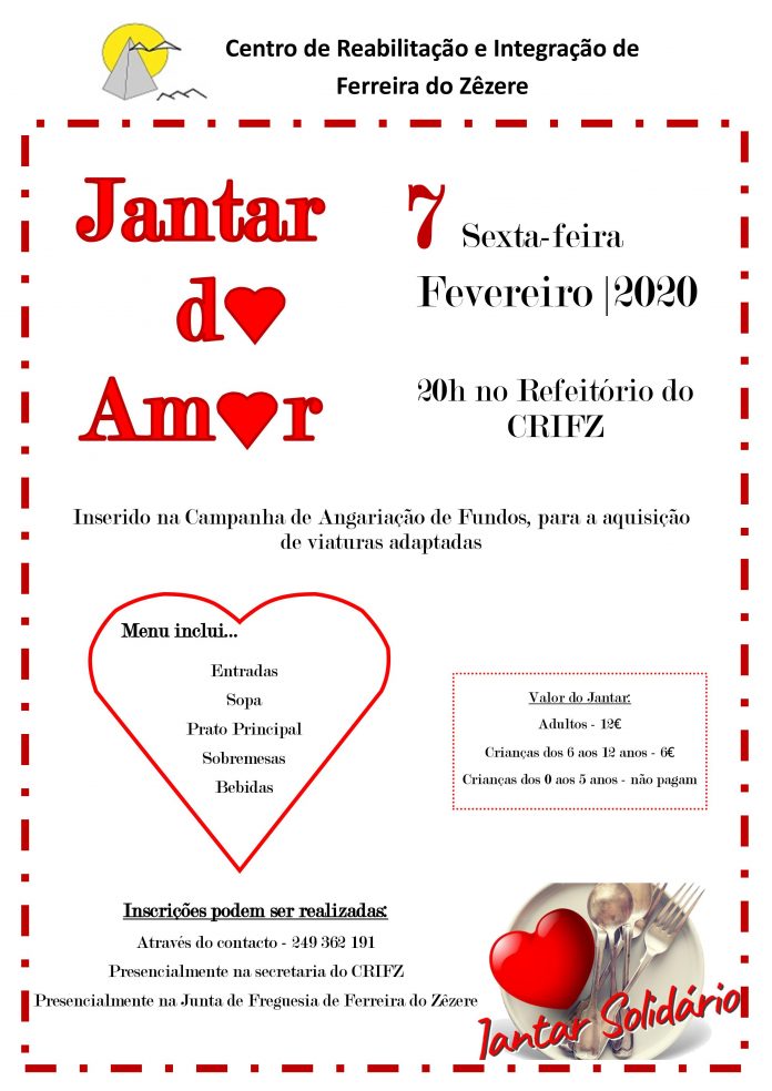 O CRIFZ, Centro Reabilitação e Integração de Ferreira do Zêzere, vai promover no próximo dia 7 de fevereiro ÀS 20H00 o “JANTAR DO AMOR”. Uma iniciativa inserida na Campanha de Angariação de Fundos, para a aquisição de viaturas adaptadas para os utentes da instituição.