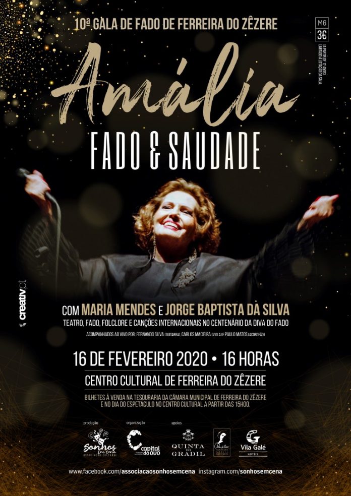 No próximo dia 16 de fevereiro decorrerá a 10ª Gala de Fado de Ferreira do Zêzere. No ano em que se assinala o centenário do nascimento de Amália Rodrigues é levado a cabo o espetáculo “Amália, Fado & Saudade” com a participação dos artistas Maria Mendes e Jorge Baptista da Silva acompanhados ao vivo por Fernando Silva (Guitarra), Carlos Macieira (Viola) e Paulo Matos (Acordeão).