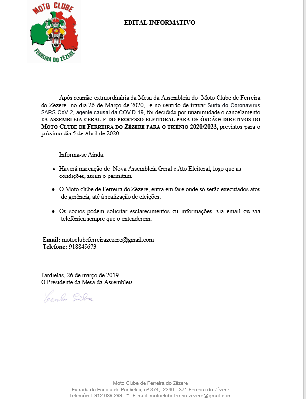 A Mesa da Assembleia Geral do Moto Clube de Ferreira do Zêzere, adia a Assembleia Geral e o Ato Eleitoral, marcada para este domingo, 5 de abril, para quando as condições assim o permitirem, no sentido de conter o Surto COVID-19. Para seu bem e de Todos, fique em casa e siga as indicações da DGS.