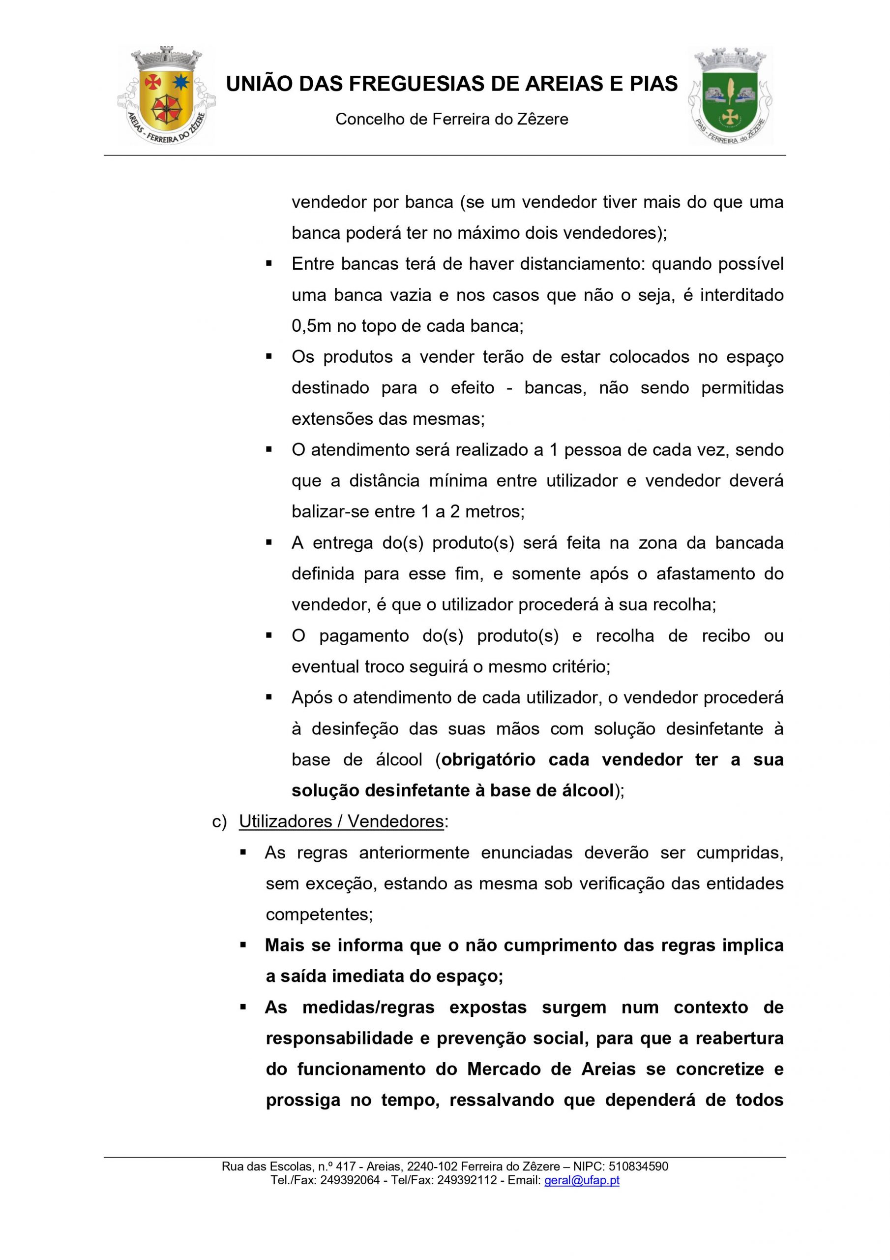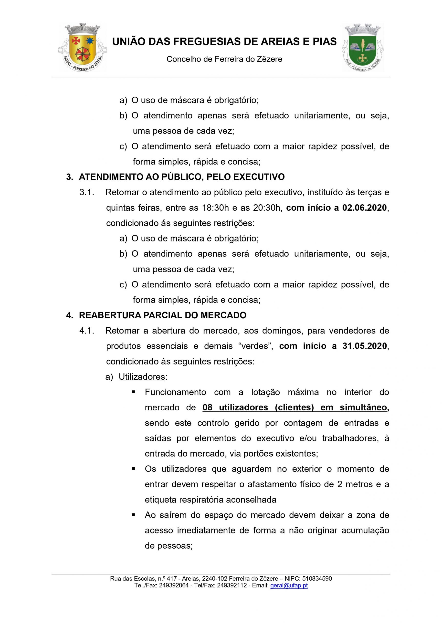 Hugo Azevedo, Presidente do Executivo da União das Freguesias de Areias e Pias informou que  face à conjuntura atual da pandemia covid 19, a partir do próximo domingo serão repostos serviços públicos e será reaberto o Mercado de Areias com novas regras de segurança.