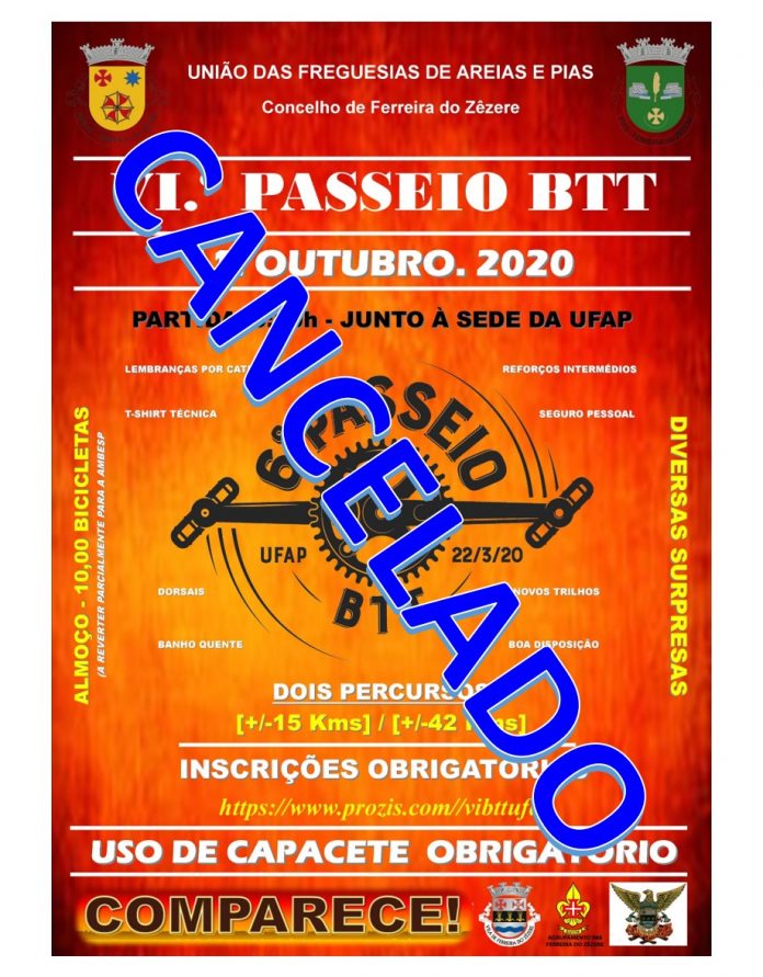 A União das Freguesias de Areias e Pias, entidade organizadora do evento “VI.º Passeio BTT da UFAP”, com data inicialmente marcada para o dia 22 de março de 2020, devido ao surto de coronavírus [COVID-19], viu-se obrigada a adiar o evento para o dia 11 de Outubro de 2020.