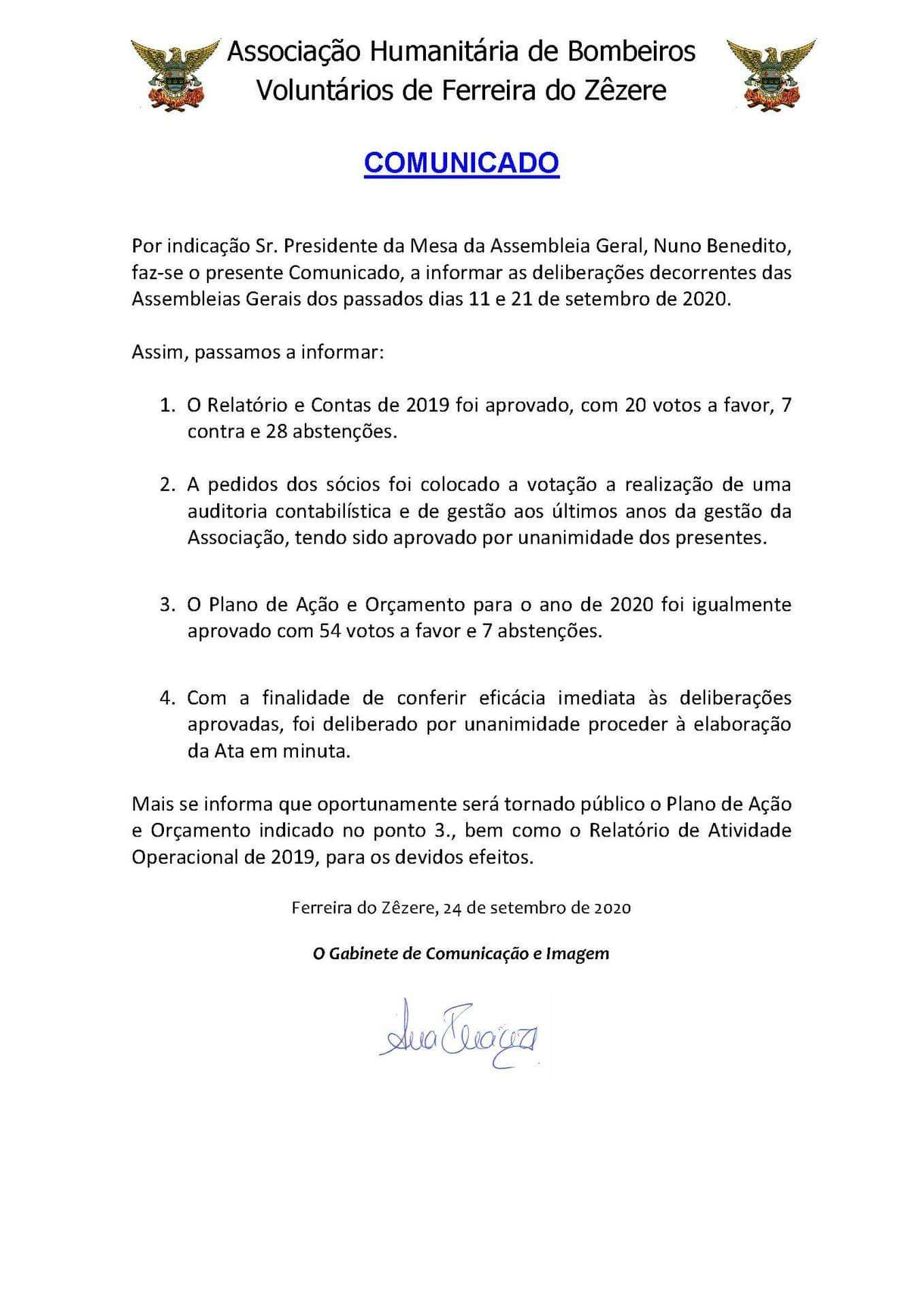 Informação do Gabinete de Comunicação e Imagem da Associação Humanitária dos Bombeiros Voluntários de Ferreira do Zêzere com as deliberações das Assembleias Gerais da Associação realizadas a 11 e 21 de setembro.