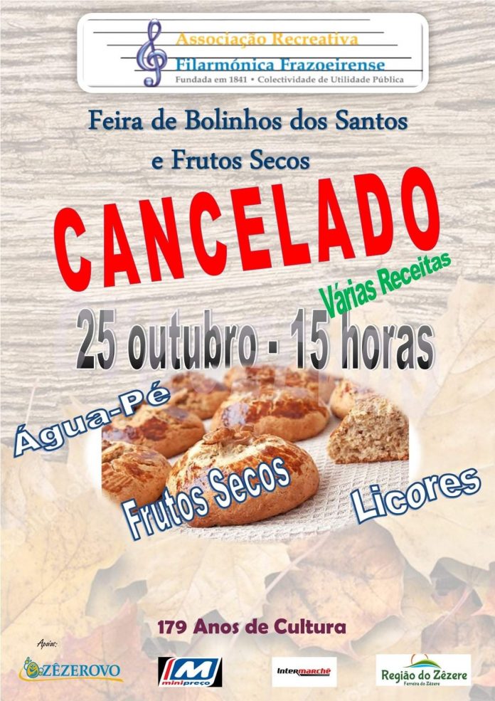 Por força da pandemia Covid-19 e da necessidade de adoção de regras que previnam a propagação do vírus, a Associação Recreativa Filarmónica Frazoeirense cancelou a XIV Feira dos Bolinhos dos Santos que se realizaria no próximo dia 25 se outubro.