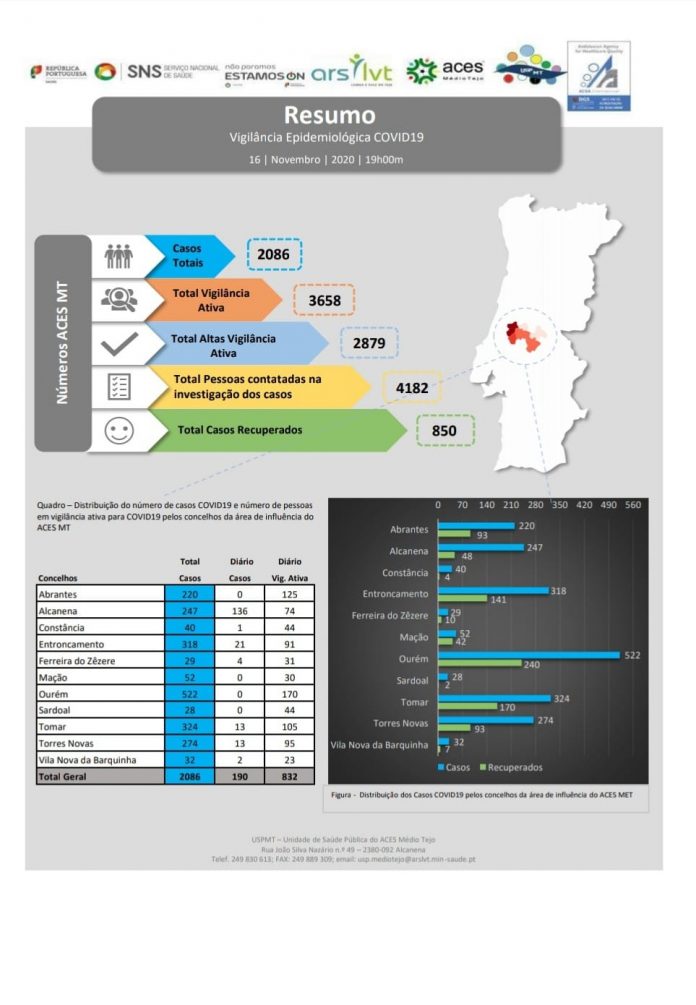 No relatório desta segunda-feira, 16 de novembro da Unidade de Saúde Pública do Médio Tejo, estão registados 4 novos casos de contaminação em Ferreira do Zêzere e estão 31 pessoas em vigilância ativa. O acumulado desde o início da pandemia é de 29.