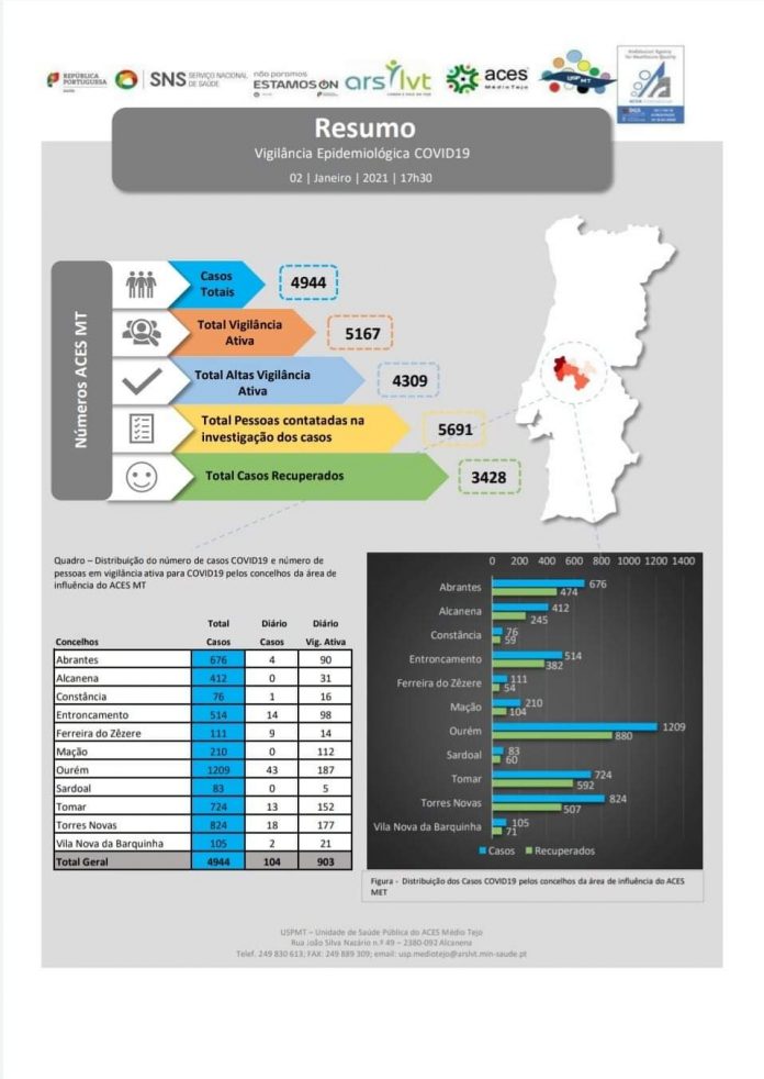 Ourém com 43 casos, Torres Novas 18, Entroncamento 14, Tomar 13,  Abrantes 4, Vila Nova da Barquinha 2 e Constância 1 caso. Estão 903 pessoas em vigilância ativa.