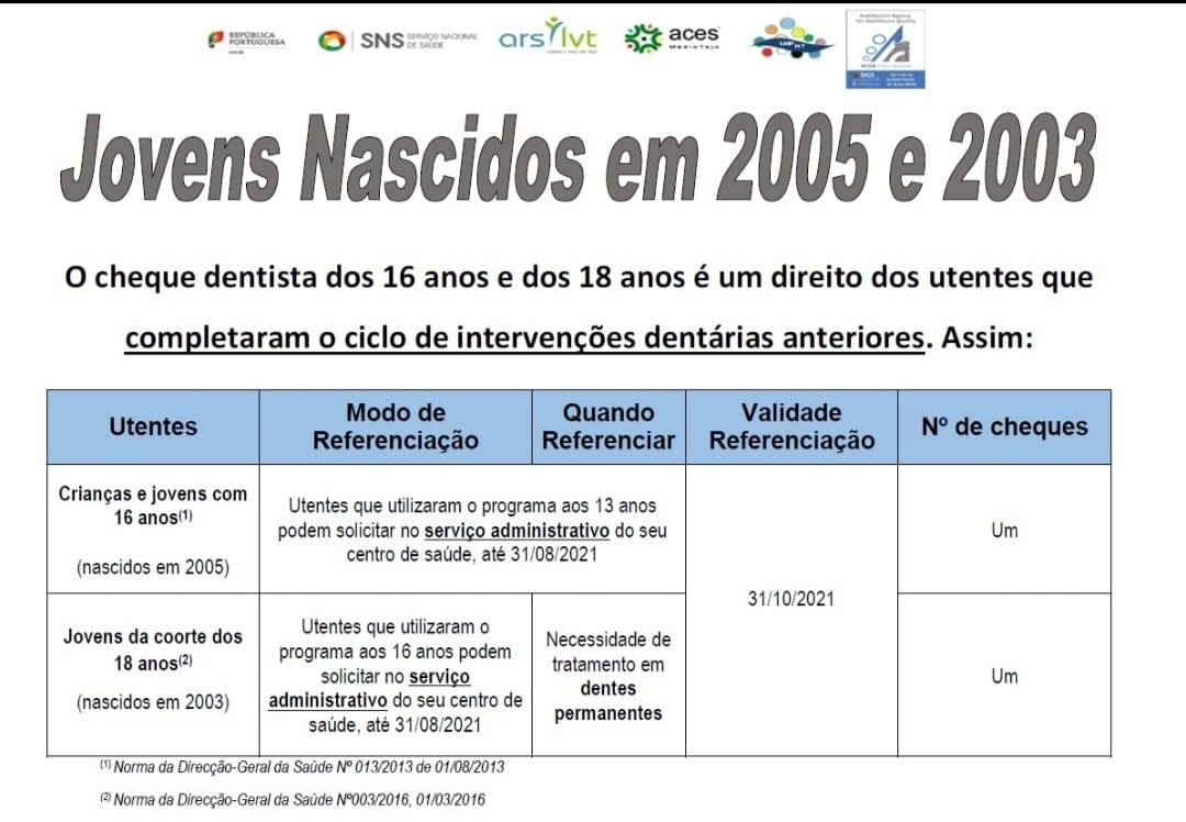 A Unidade de Saúde Pública do Médio Tejo (USPMT) informa que já estão disponíveis os  Cheques dentista para jovens nascidos em 2005 e 2003.
