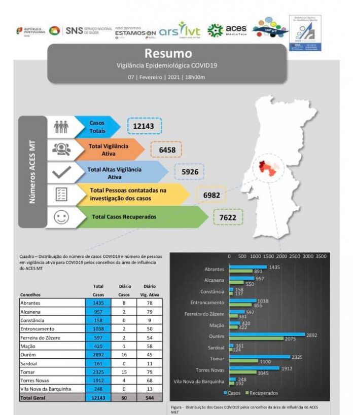No relatório deste domingo, 7 de fevereiro, da Unidade de Saúde Pública do Médio Tejo (USPMT), há registo de 2 novos casos de contaminação em Ferreira do Zêzere e 54 pessoas em vigilância ativa. O acumulado desde o início da pandemia é de 597 casos.