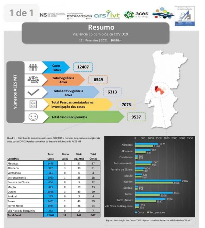 No relatório desta segunda-feira, 15 de fevereiro, da Unidade de Saúde Pública do Médio Tejo (USPMT), não há registo de novos casos de contaminação em Ferreira do Zêzere e estão 3 pessoas em vigilância ativa. O acumulado desde o início da pandemia é de 604 casos e 12 mortos.