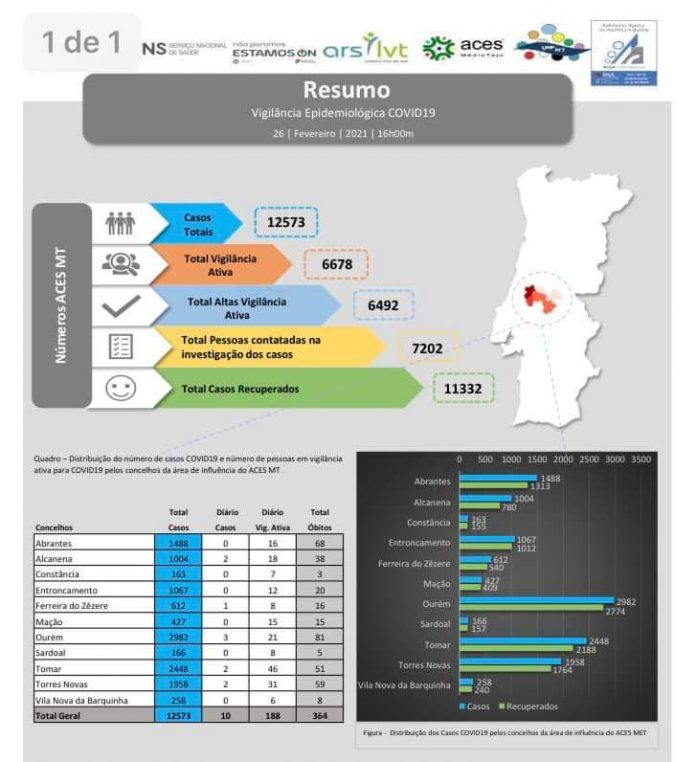 No relatório desta sexta-feira, 26 de fevereiro, da Unidade de Saúde Pública do Médio Tejo (USPMT), há registo de 1 novo caso de contaminação em Ferreira do Zêzere, estando 8 pessoas em vigilância ativa. O acumulado desde o início da pandemia é de 612 casos e 16 mortos.